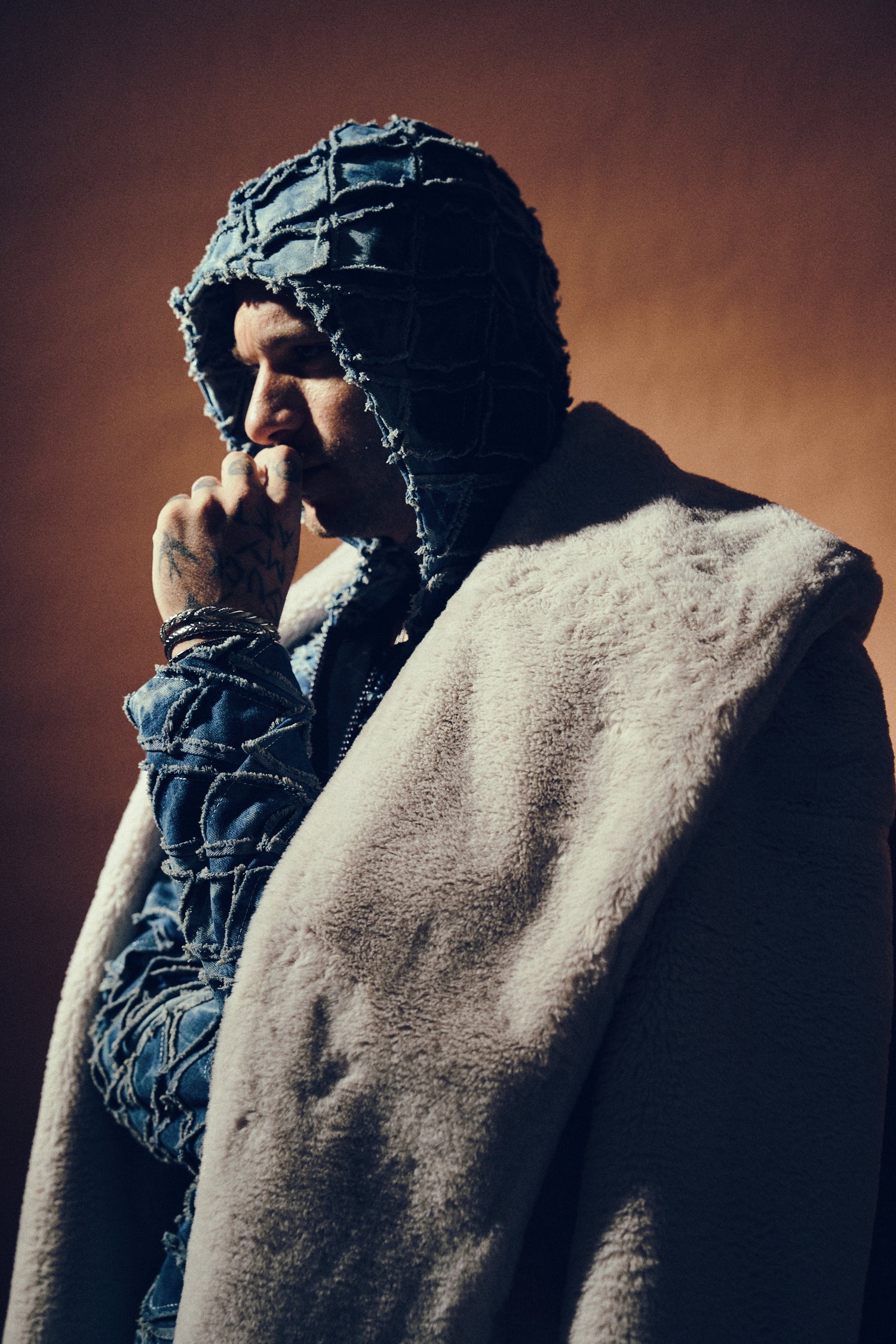 “A bold interplay of textures and attitude. Raw-edged denim meets soft shearling, creating a statement look that balances rugged rebellion with refined comfort. A vision of modern masculinity, unapologetic and effortlessly stylish.”