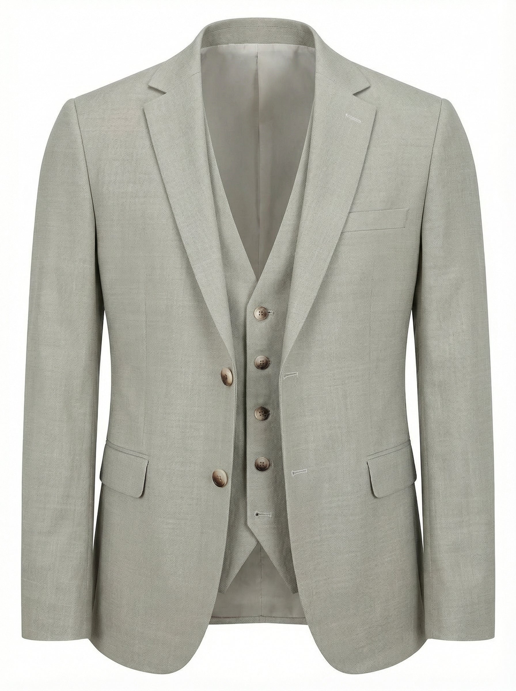 A refined and modern three-piece suit crafted in a soft beige tone, offering a clean and sophisticated look ideal for weddings, summer events, and elegant daytime occasions.