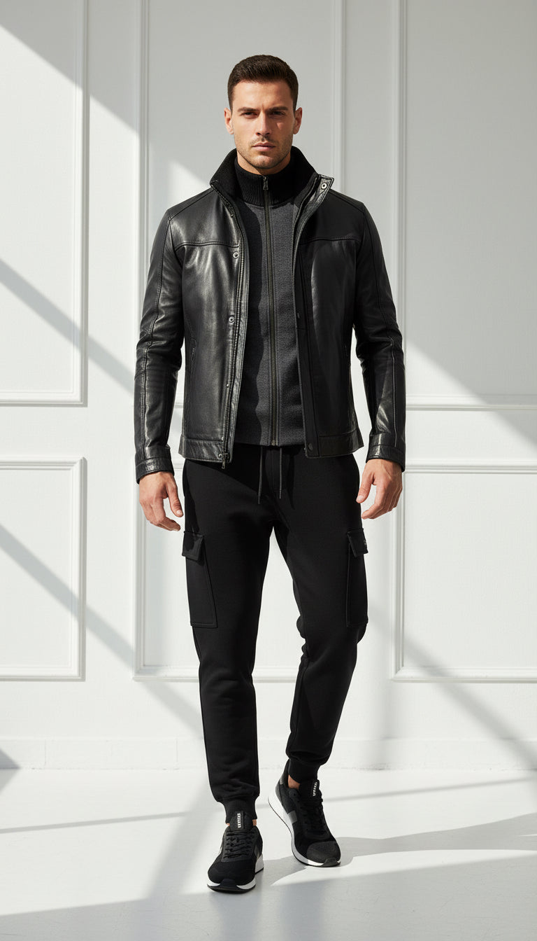 The Guy Laroche Black Leather Jacket is a statement piece of refined masculine elegance.