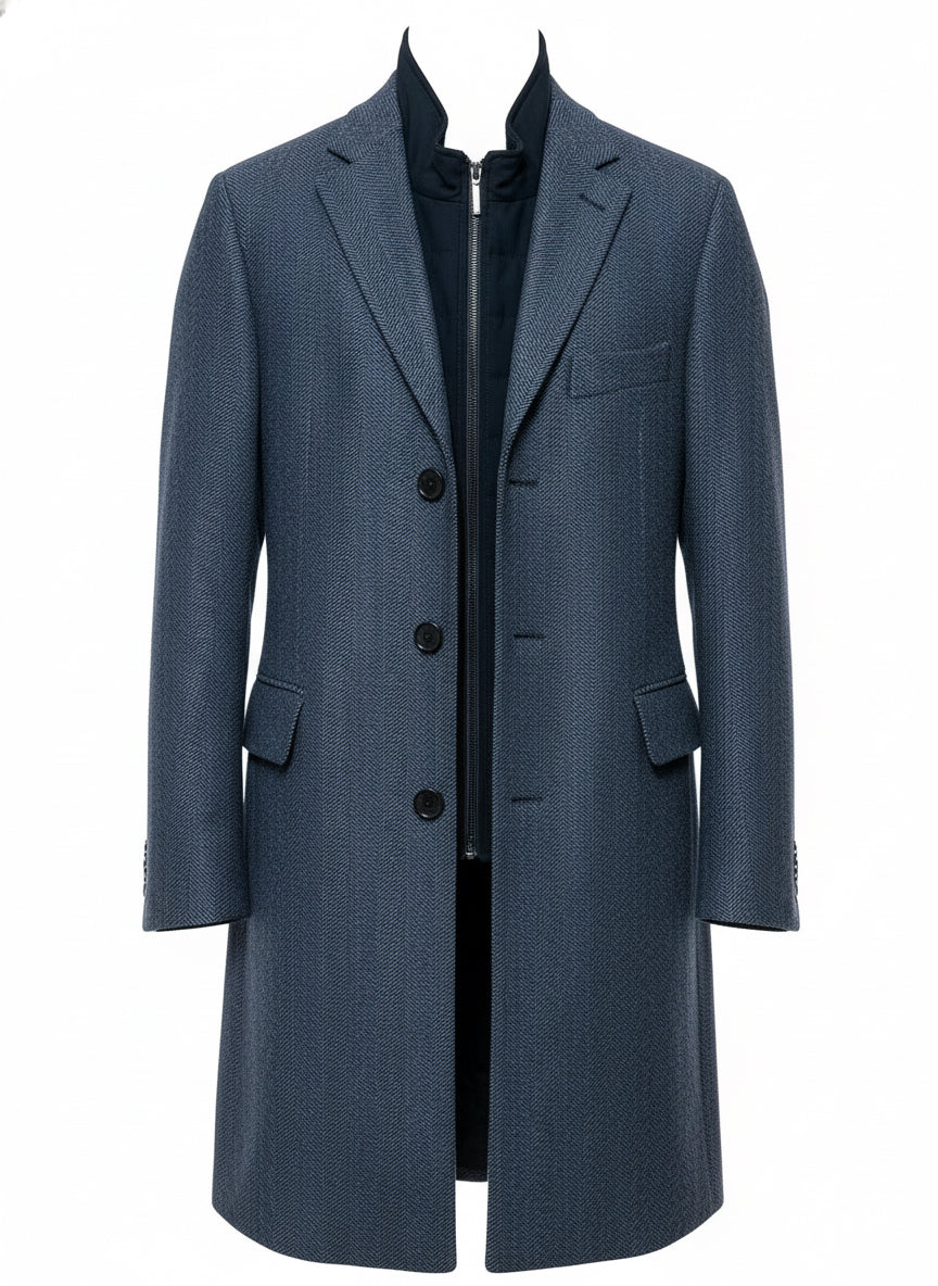 Blue Wool Coat with Quilted Inner Vest – Timeless Sophistication