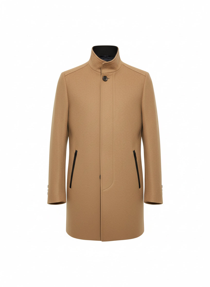 This camel-colored coat blends elegance and practicality through its clean lines and detachable technical hood. Designed from premium structured fabric with subtle texture, it provides warmth, comfort, and weather resistance without compromising on style. The contrasting black details add a modern edge to a timeless silhouette.