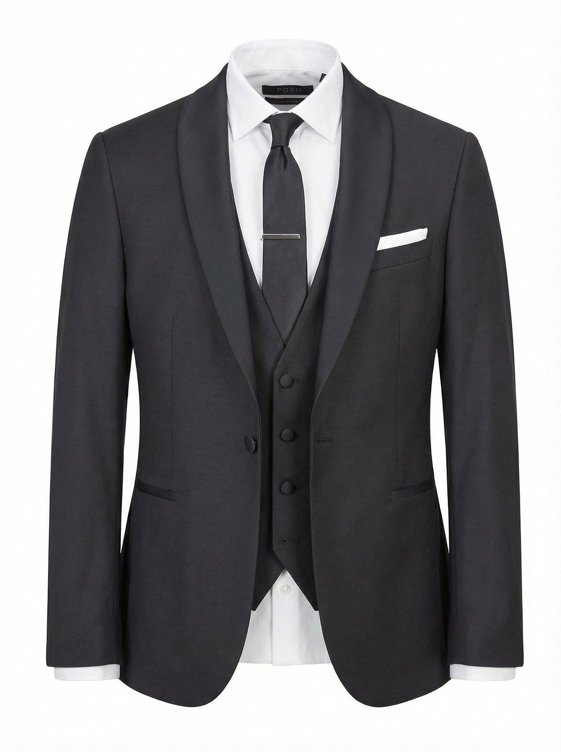 The matching waistcoat maintains the refined aesthetic, while the tailored trousers complete a clean, modern silhouette. Finished with satin-trimmed welt pockets, covered buttons, and precise structuring, this tuxedo delivers sophistication for any high-end event.